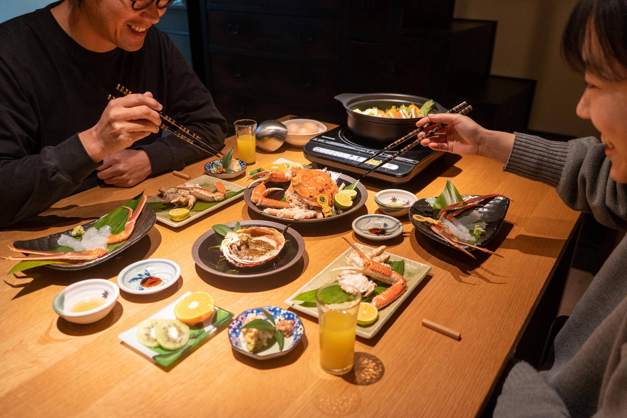 福井の冬の味覚である越前がにを贅沢に使用したプランも同日、販売開始しました。『焼きかに』のように、宿の中で一手間加えてもらった上で召し上がっていただくメニューが含まれていますが、普段料理をされない方もご安心ください。専用スタッフが美味しい一手間の加え方をデリバリー時にレクチャーさせていただきます。プライベートが守られた一棟貸しの宿で、人目を気にせず、豪快に召し上がってください。