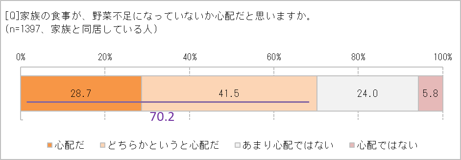 そのいっぽうで、自分もさることながら、家族の野菜不足も気になるという人は70.2%。「家族のために主食・主菜・副菜まで作りたいと思うができない」(30代・専業主婦)、「育ちざかりだからしっかり食べてほしいのに、子どもが野菜嫌いで残してしまう」(40代・パート)など、料理を通して家族の健康に大きく関与する立場ながら、理想と現実のギャップに悩む人が多いようです。