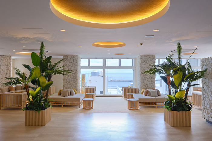 オフホワイトの家具や、貝殻を模した素材を使った照明、柱には本物の珊瑚石を貼り込み、白い砂浜から沖合を眺める気分をお楽しみいただける空間です。