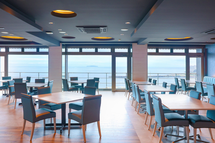 こちらは大きなガラス窓の向こうに熱海の海を眺める明るい空間です。