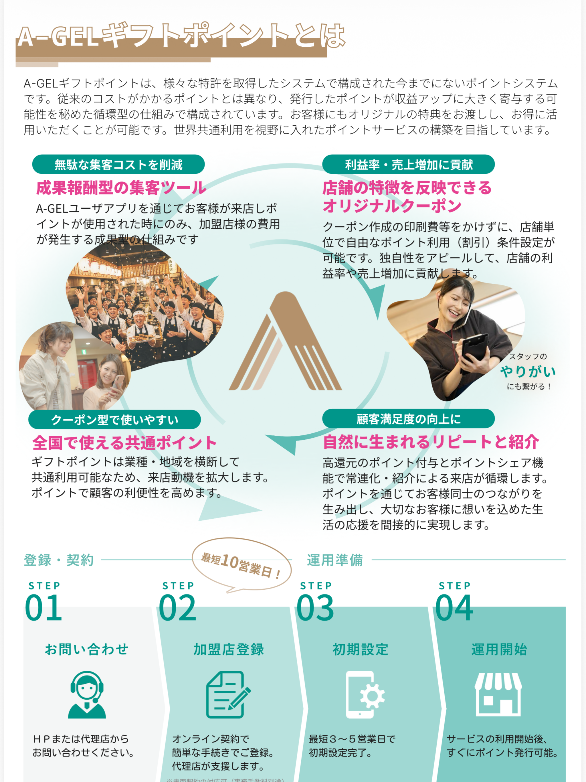 A-GELギフトポイントは、企業・店舗・消費者をつなぐ循環型ポイントシステムであり、