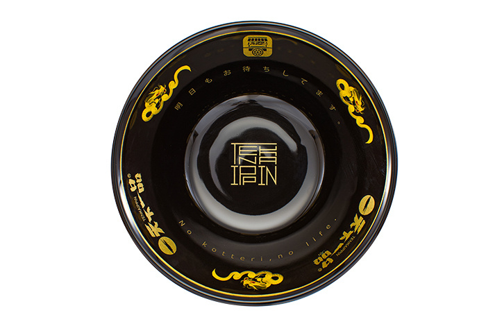 縁にデザインされた黄金に輝く龍は、京都・桜凛堂の一筆龍絵師・手島啓輔氏が天下一品のために描いたもの。一筆龍とは、龍の胴体部分を一筆で描き「ひとつなぎで途切れない」ことから「人を繋ぐ」「ご縁が途切れない」と縁起が良いとされています。