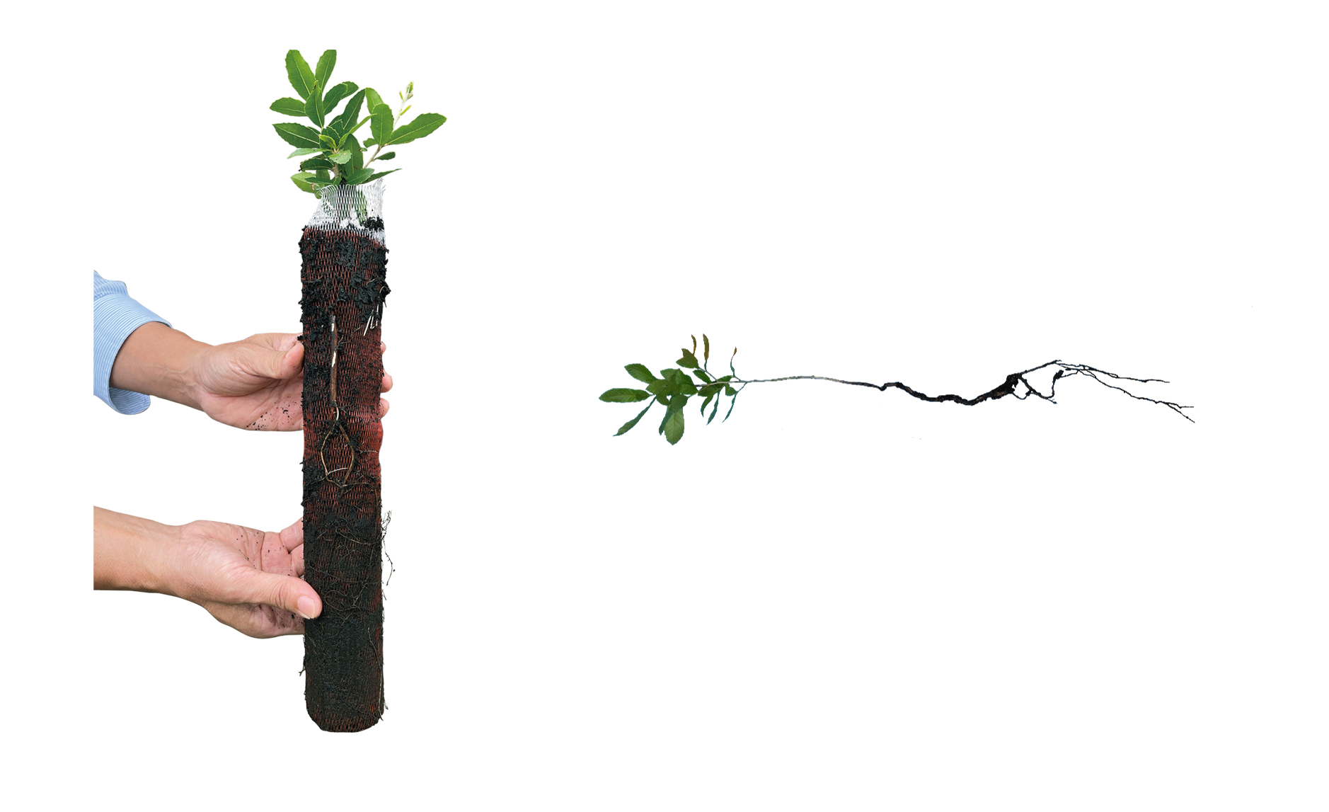 植物が重力方向へ根を伸ばす性質「重力屈性」を活かし、直根を長く成長させた「直根苗」