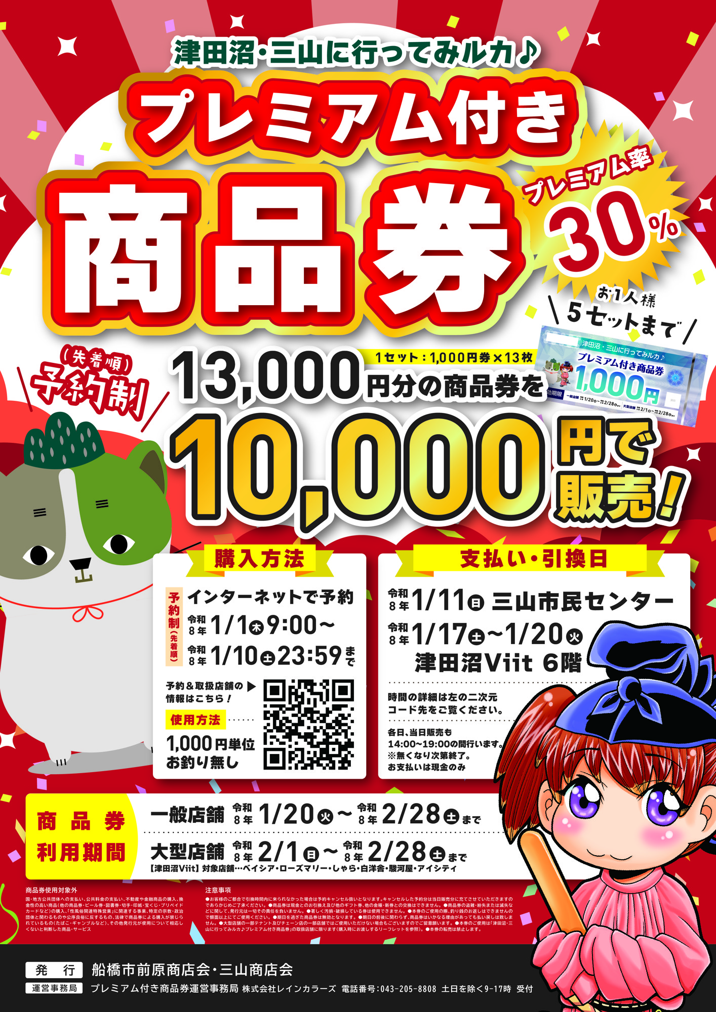 商品券名:「津田沼・三山に行ってみルカ♪ プレミアム付き商品券」
