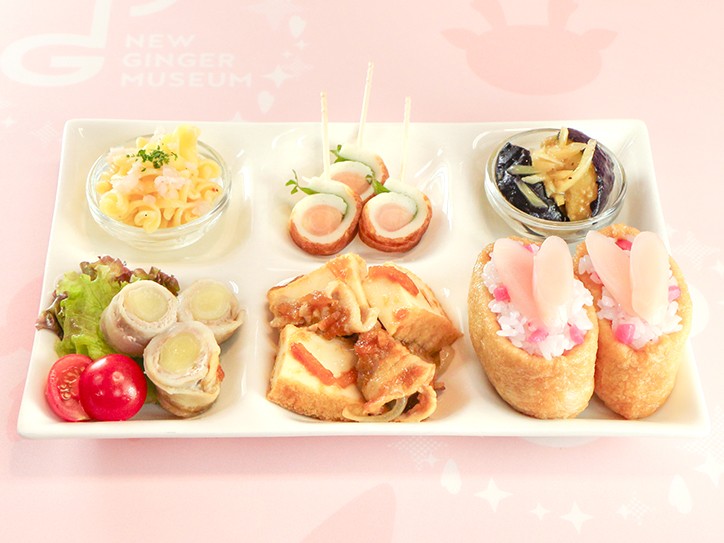 O-MENZの5人とイワシカちゃんをイメージした、岩下の新生姜メニュー6種の盛り合わせプレート。ショートパスタ、ちくわ巻き、揚げナス、いなり寿司、厚揚げの生姜焼き、肉巻きと、岩下の新生姜を多彩に使用したメニューを一度に楽しめます。