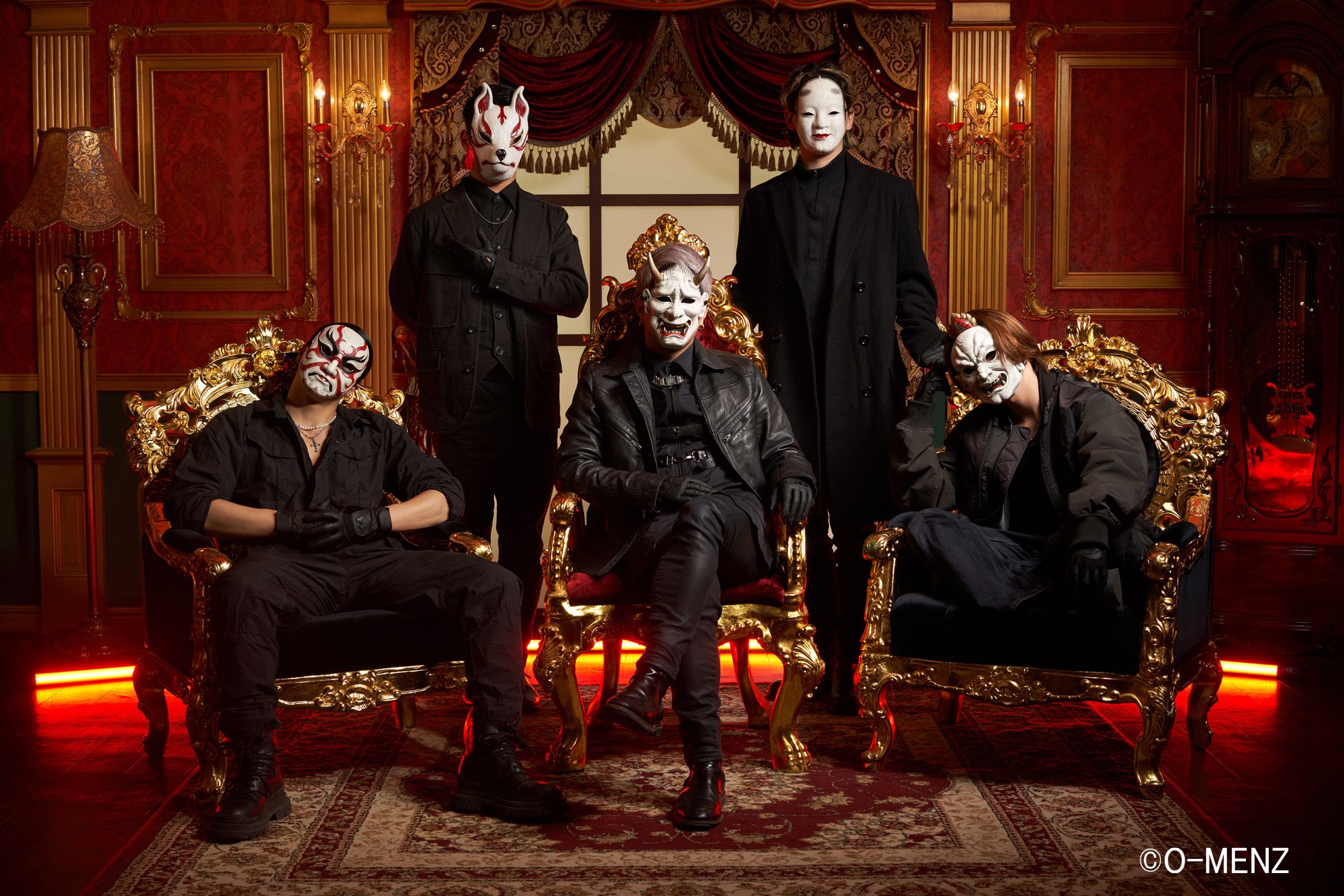 メンバーは、左から 隈取、狐、般若(リーダー)、おかめ、阿形。