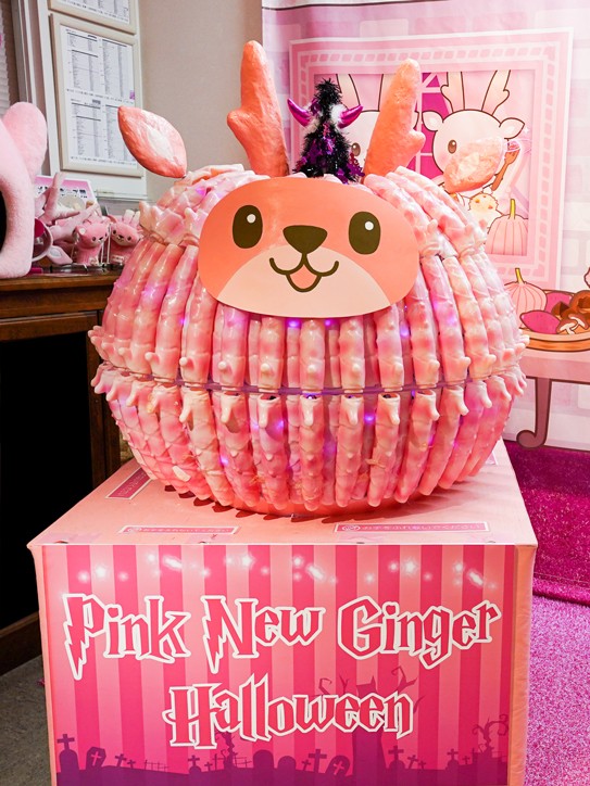 ハロウィンモチーフのフォトスポット 「ピンクの魔法学校と空飛ぶ岩下の新生姜ほうき」が今年も登場。岩下の新生姜ペンライトで作ったピンクに光るオブジェ「イワシカかぼちゃランタン」とあわせて、ピンクの魔法学校から岩下の新生姜ほうきに乗って飛び立つようなトリック写真にチャレンジできます。