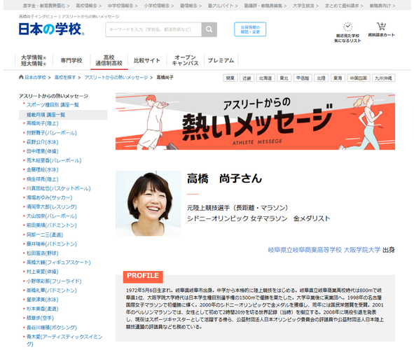 全国の大学・短大・専門学校などの学校情報を提供する、株式会社JSコーポレーション(本社:大阪市北区 代表取締役社長:米田英一)は、アスリートからの熱いメッセージ「陸上/高橋尚子さん(https://school.js88.com/scl_h/onepoint-advice/sport?menu=1&item=9&athlete=240 )」を公開しました。