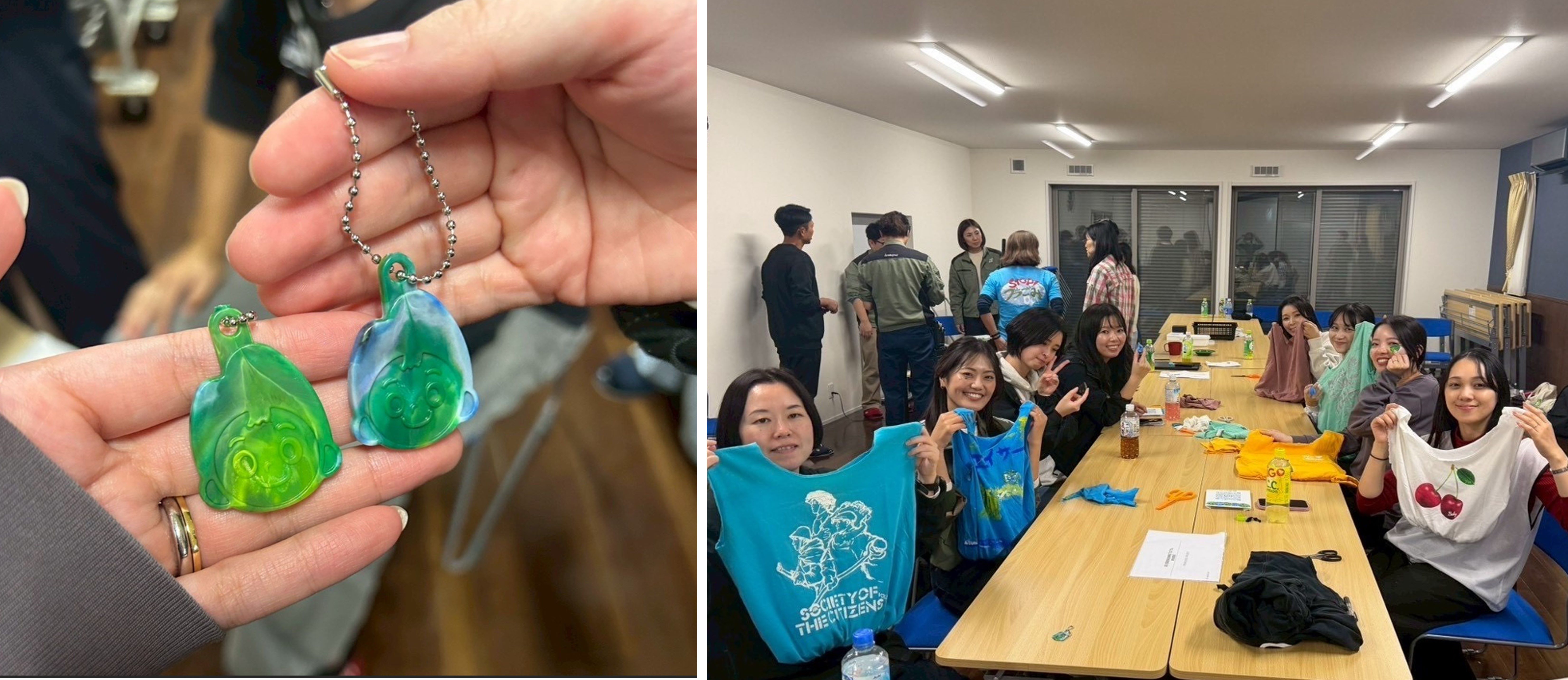 午後は、環境問題に関する学びと体験型ワークショップが実施されました。まず大阪海さくらより、淀川や身近な環境問題の事例紹介が行われ、参加者は地域環境の課題を理解しました。続くワークショップでは、サナダ精工株式会社と近畿大学松本ゼミの皆さまと協働し、プラスチック製品の再生体験やアップサイクル体験を実施。回収したエコキャップを射出成型機にかけ、キーホルダーを作成しました。また、不用になったTシャツを用いたエコバッグ作りでは、廃棄物を新たな価値ある製品に変えるアップサイクルの概念を実際に体験し、環境配慮の具体例を理解しました。その後のディスカッションでは、廃プラスチック削減や環境への取り組みについて意見交換が行われ、参加者の学びをさらに深めました。