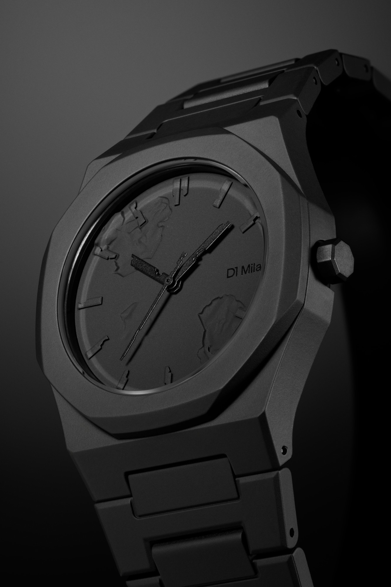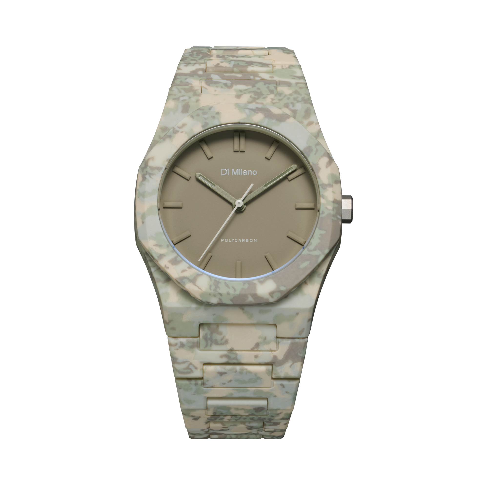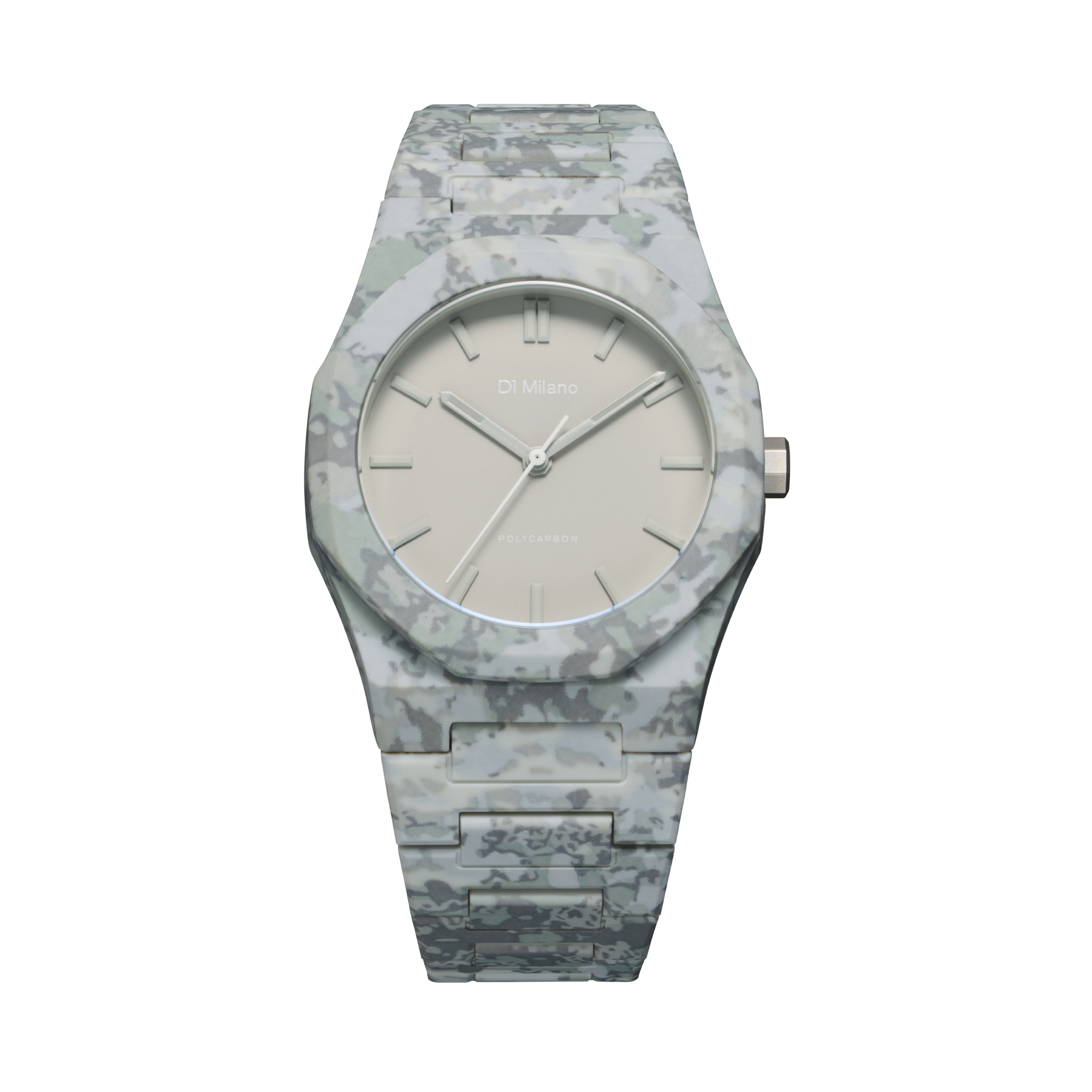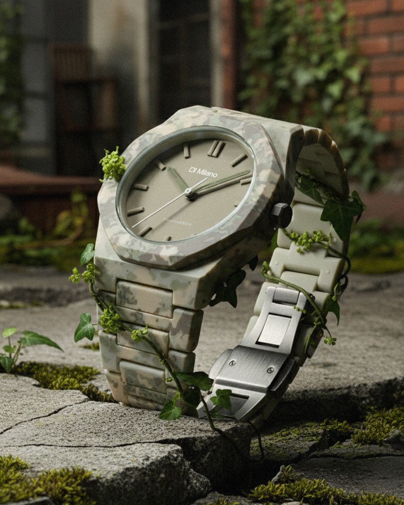 自然のフラクタル構造から着想を得た、有機的で抽象的なカモパターン。ケース、ダイヤル、ブレスレットを一体化させ、視覚的なノイズを削ぎ落としたモダンカモ。