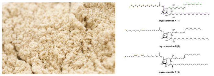 研究グループは、まだあまり機能が解明されていない、「アシル化グルコシルセラミド」という脂質に着目し、米糠の副産物から新たに3種類を単離して、その化学構造を明らかにしました。いずれも新規の化合物だったため、米の学名Oryza sativaに因んで「oryzaceramide A」、「oryzaceramide B」、「oryzaceramide C」と命名しました。