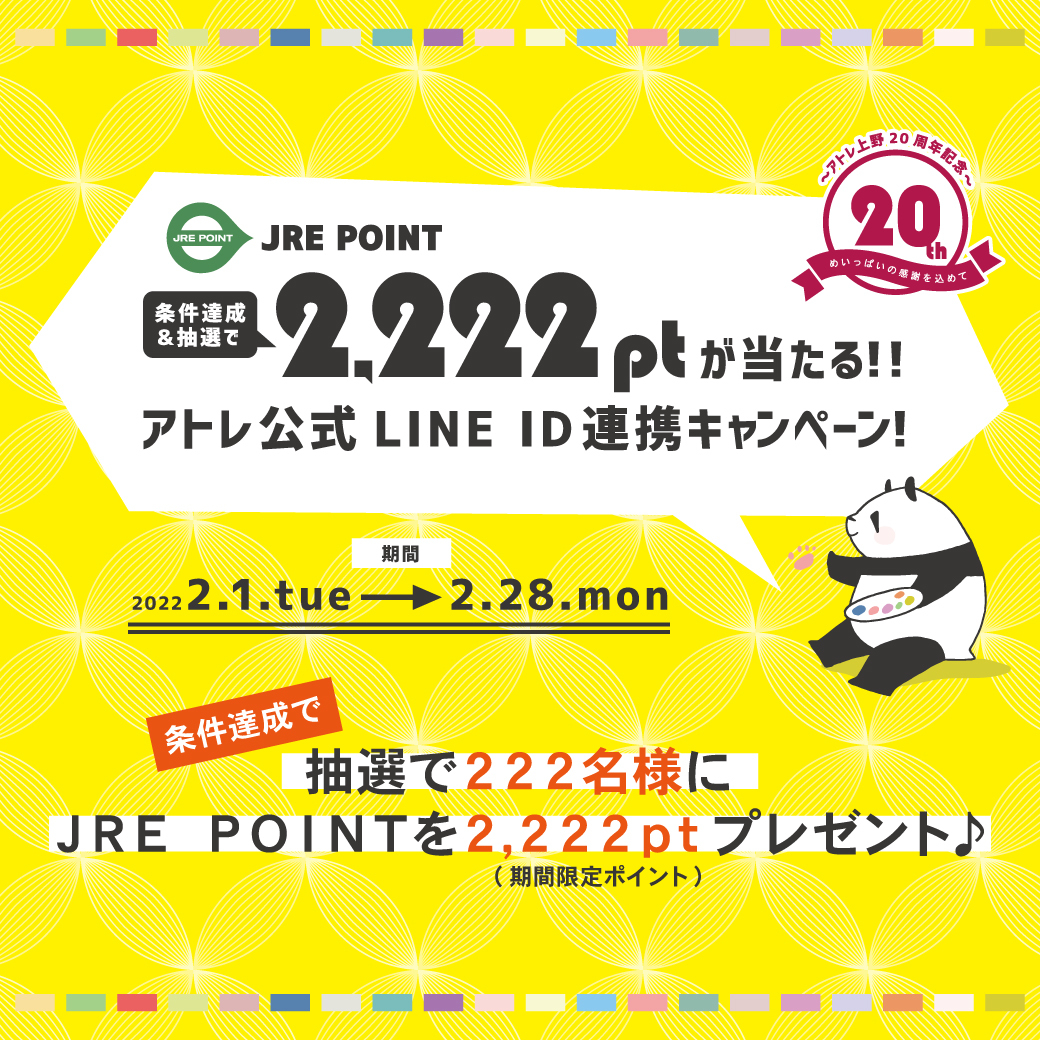 JRE POINT 2,222ptが当たる!アトレ公式LINE ID連携キャンペーン!参加条件を達成し抽選で222名様にJRE POINT 2,222ptが当たるアトレ公式LINE ID連携キャンペーンを開催します!期間中、アトレ公式LINE友だち登録のうえ、JRE POINTとアトレ公式LINEをID連携し、税込10,000円以上お買上げのお客様にJRE POINTをプレゼント。