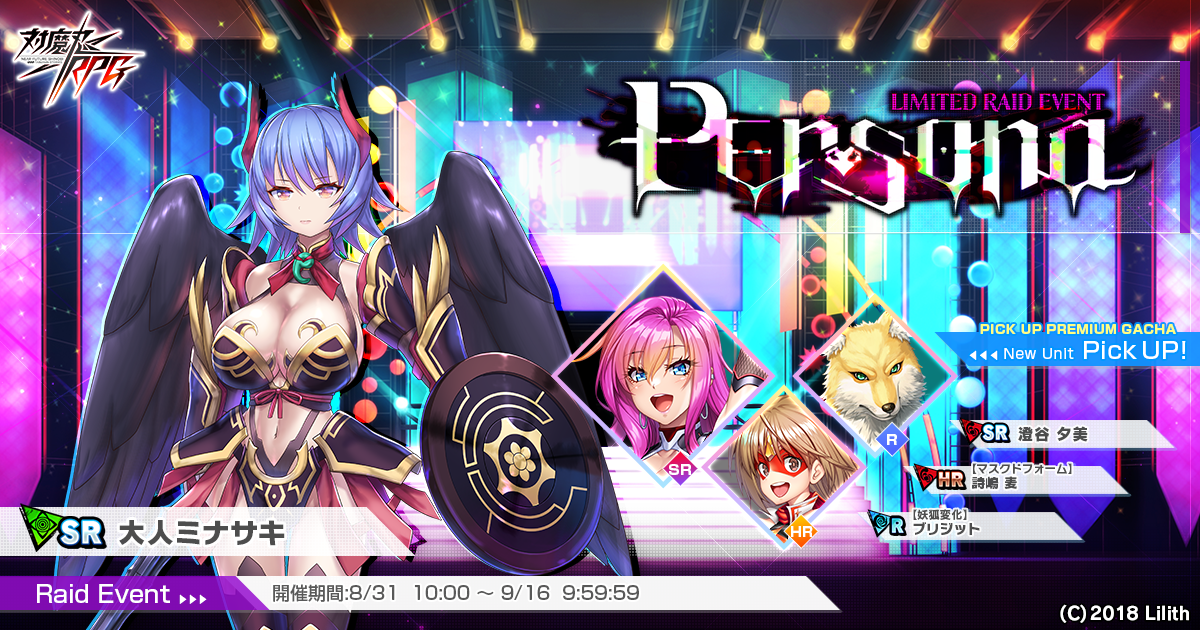 株式会社インフィニブレイン(本社:大阪市中央区、代表取締役:武山 英治)は、オンラインゲームプラットフォーム「DMM GAMES」( https://games.dmm.com/ )にて配信している、近未来くノ一ロールプレイングゲーム『対魔忍RPG』は、8月31日(土)より限定ユニットを獲得できる期間限定レイドイベント「Persona」などをお知らせいたします。
