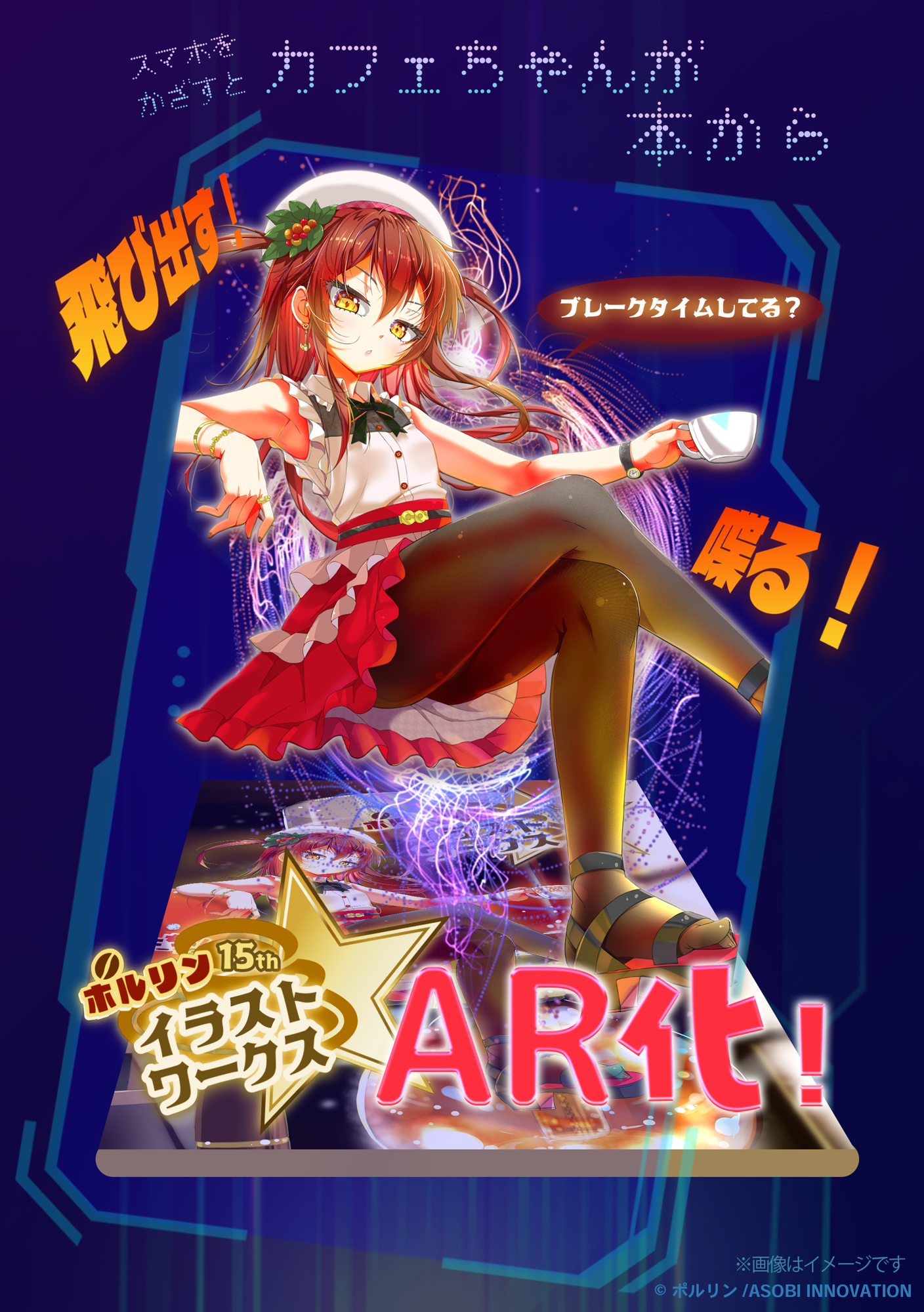 『ポルリン15thイラストワークス』の表紙にスマートフォンをかざすと「カフェちゃん」が飛び出してしゃべる仕掛けを実現。