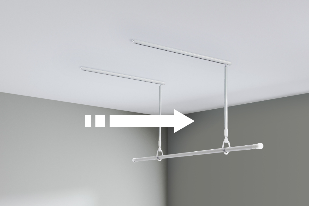 TAR5686は、物干し竿を付けたままレールに沿って壁際へスライド可能。