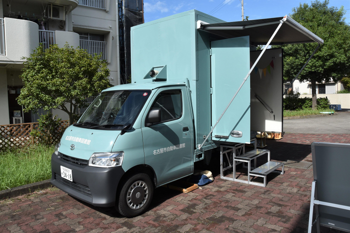 自動車図書館の家具を使って天白図書館職員による絵本の読み聞かせ