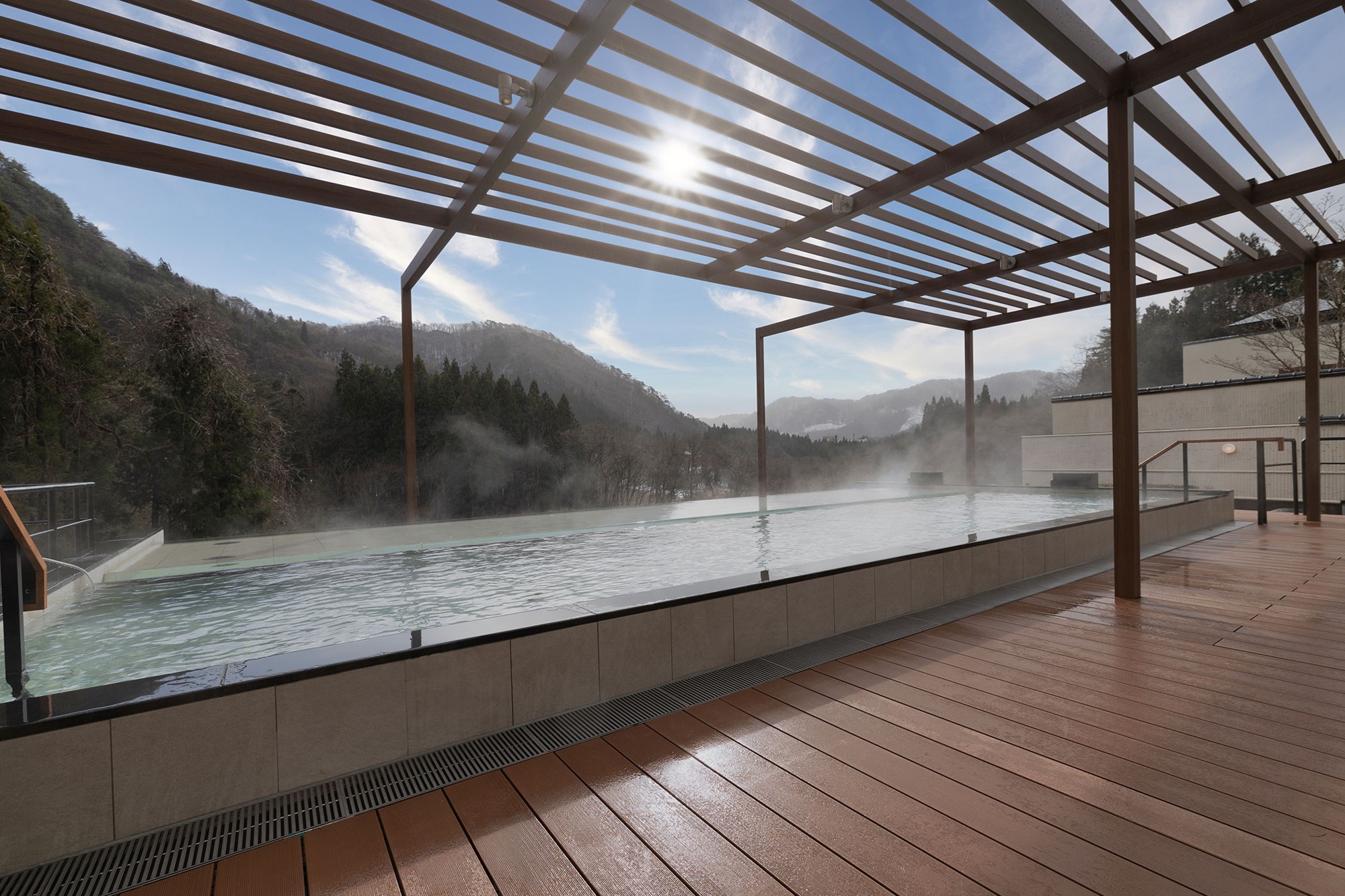花巻温泉郷は、宮沢賢治をはじめとする文豪たちが愛した温泉地としても有名です。歴史ある建物や湯治文化が残り、レトロな雰囲気を楽しめるだけでなく、豊かな自然に囲まれているので、四季折々の美しい景色を眺めながら温泉を楽しめるのも魅力のひとつです。そんな岩手・花巻の自然と文化が息づく、プレミアムラウンジは大きな窓から差し込む光と美しい景色を存分にお楽しみいただけます。暖炉の優しい炎に癒されながら、ドリンク片手に特別なひと時をお過ごしいただけます。大浴場は、至福の温泉体験をご満喫いただくため、既存の露天風呂を拡張し「インフィニティ温泉」としてリノベーションいたしました。湯に浸かると視界に広がるのは壮大な渓谷の風景。崖からせり出すように造られた湯船は、まるで渓谷の上に浮かんでいるかのような浮遊感を味わえます。
