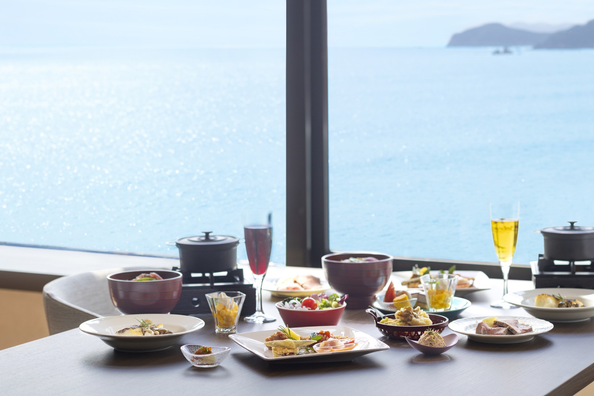 ロビーの先に広がるのは、明るく開放的なオーシャンラウンジ。ご用意しているドリンクを楽しみながら、心地よい波音と目の前に広がる空と海を全身で感じながら、思い思いの贅沢な時間をお過ごしいただけます。TAOYA南志摩の魅力の1つでもあるインフィニティ温泉からは、日本の夕陽百選に選ばれた志摩市浜島町の黄金色に染まる海の絶景をお楽しみいただけます。落ち着きのある空間で、海を眺めながらゆったりと湯あみをご堪能ください。お食事は、イタリアの田舎町をイメージした、温かくほっとひと息つけるような雰囲気のレストランで、伊勢志摩の食材を使用した地中海グルメをお楽しみいただけます。