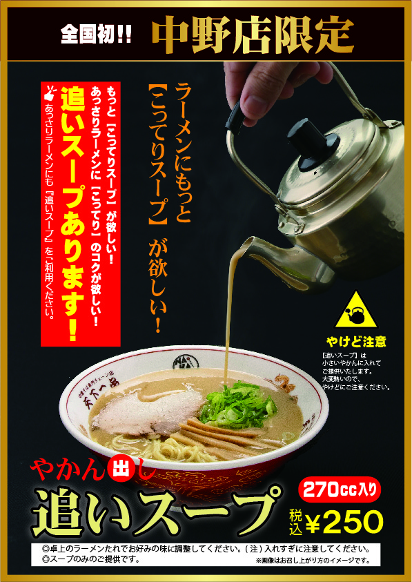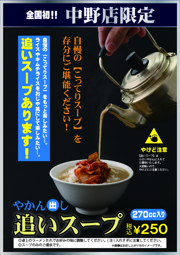 “天下一品中野店限定” 12月7日(月)より期間限定にて『追いスープ』を販売