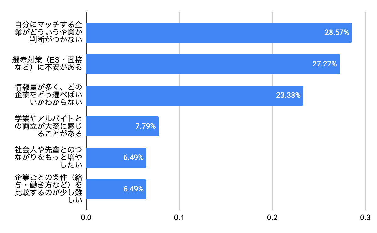 就職活動において困っていることを複数回答で聞いたところ、「自分にマッチする企業がどういう企業か判断がつかない」が最多の28%、「情報量が多く、どの企業をどう選べばいいかわからない」が23%という結果となりました。