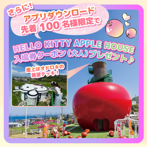 また、「淡路島西海岸」アプリをダウンロードいただいた先着100名様には、ハローキティのりんごのおうちをコンセプトにした世界最大のりんご型展望シアター「HELLO KITTY APPLE HOUSE」の入場クーポンをプレゼントいたします。