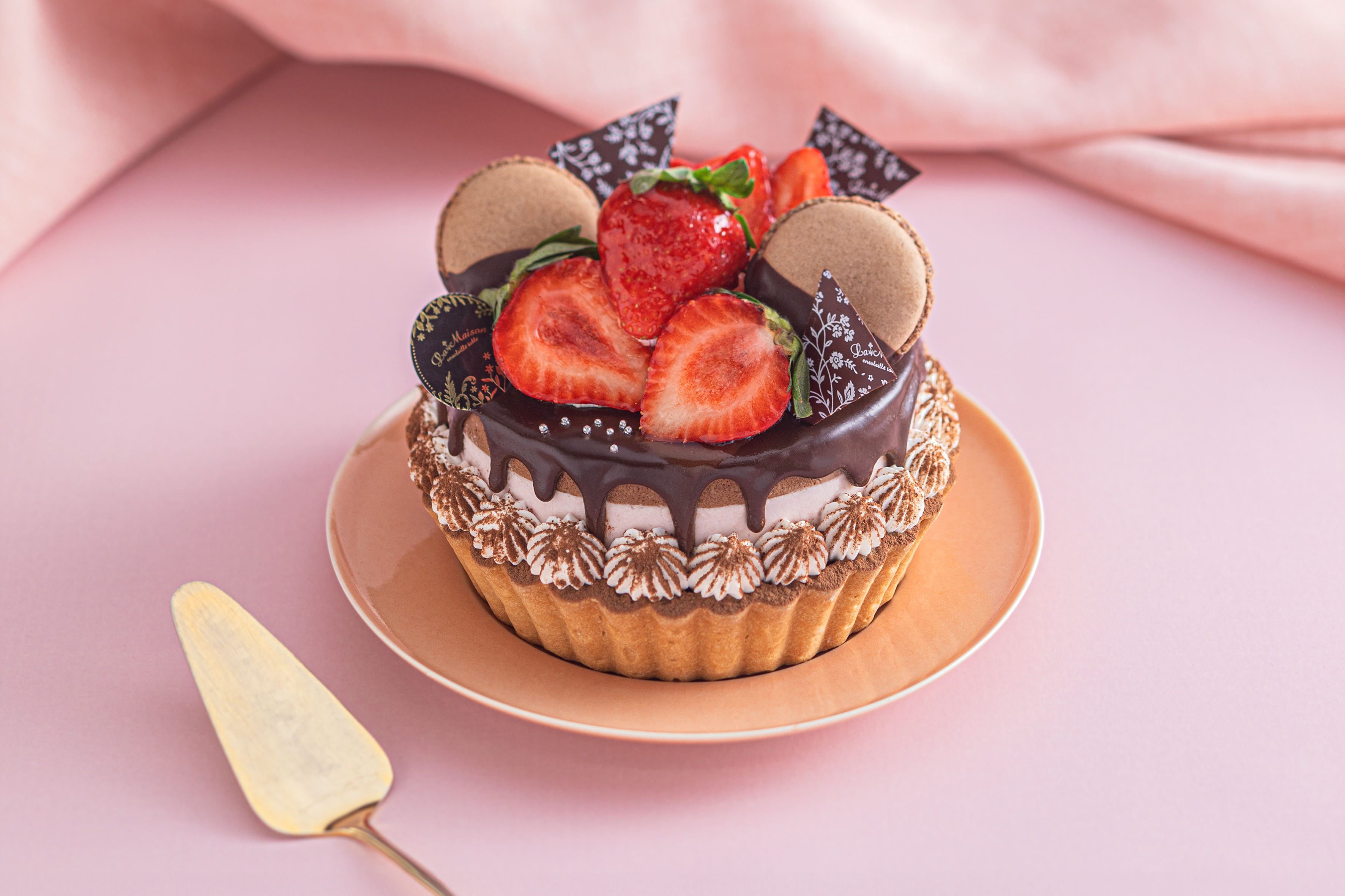甘酸っぱいいちごムースに濃厚なベルギーチョコレートを使用したショコラティームースを重ね、チョコレートをたっぷりとかけました。ガナッシュをサンドしたショコラマカロンとあまおうを華やかに飾りました。