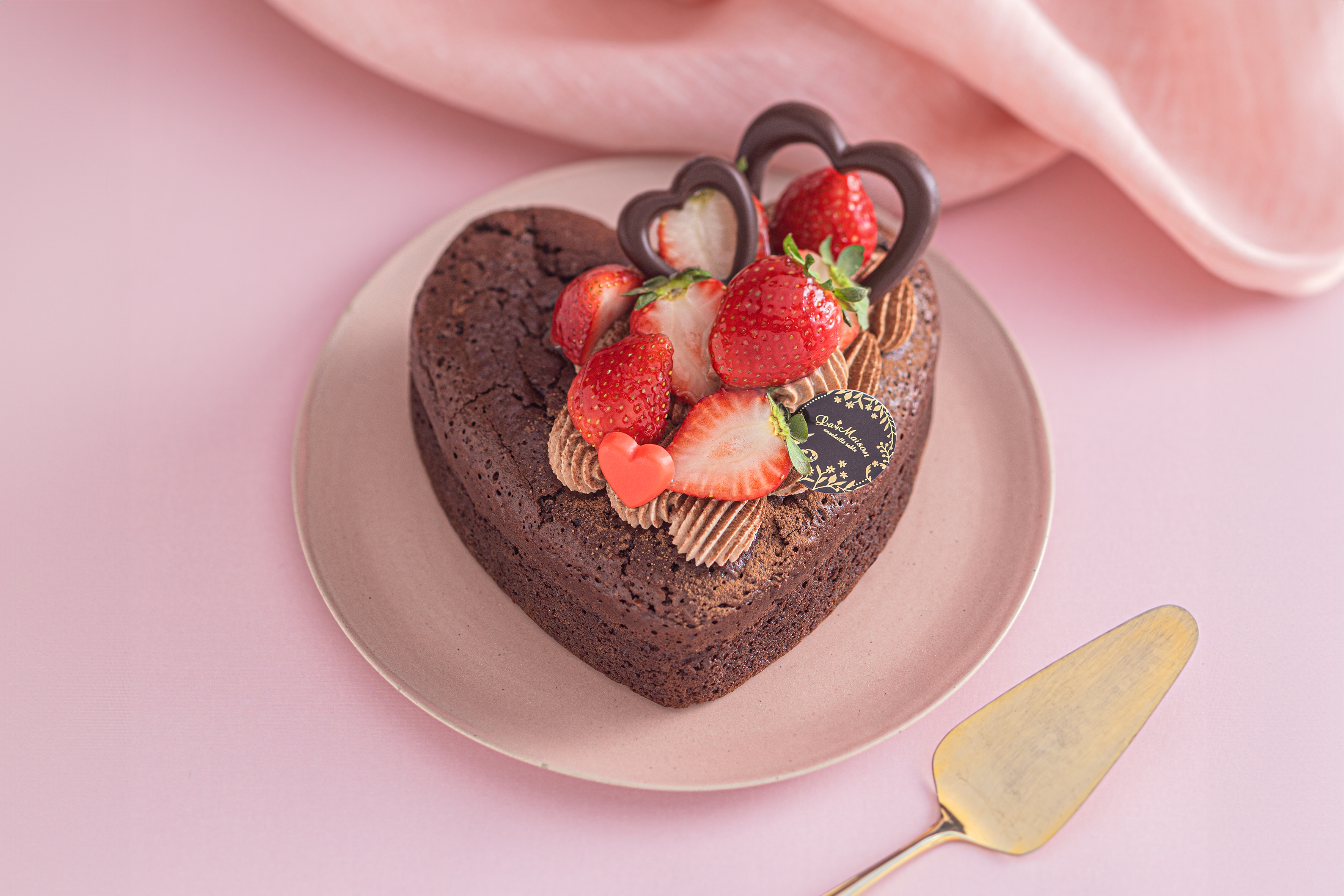 しっとり焼き上げた濃厚なガトーショコラ。甘酸っぱいいちごを飾り、可愛らしいハートチョコレートをあしらいました。