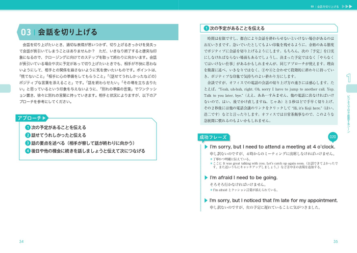 「答えたくない質問をかわす」「目上の人に催促する」「仕事の依頼や誘いを断る」など対応の仕方が難しい26のビジネスシーンを厳選して取り上げ、うまく切り抜けるためのプロフェッショナルなアプローチ方法とそのまま使えるシンプルな英語のフレーズを満載しています。