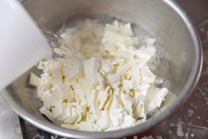 カードと呼ばれる、チーズ職人により発酵加減が調整されチーズになる前の状態に、熱湯を注ぎます。カードに熱が伝わり柔らかくなったら、湯の中で手作業で練っていきます。お湯に長く浸け過ぎると湯に溶けミルキーさが失われ硬い仕上がりに、漬ける時間が短いと成形しにくいため、タイミングを見計らいながら素早く練り込み成形します。