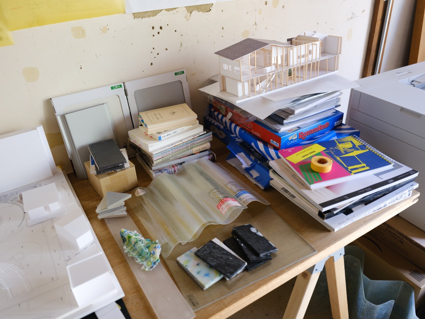 建築やデザインに関する書籍・雑誌のほか、紙や布、タイルといった素材サンプル、実験的な小作品などが並ぶ場所。だれかが置き去った試作の断片やラフに積み上げられた書籍が、インスピレーションの源泉となります。