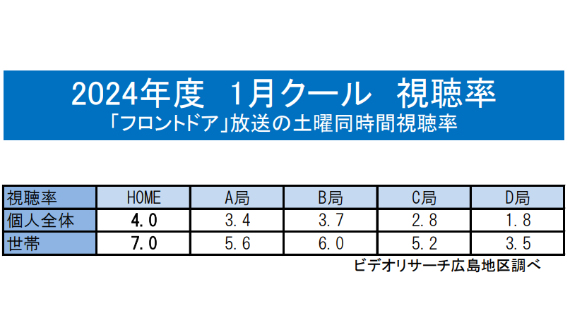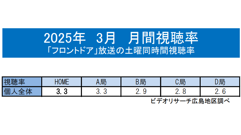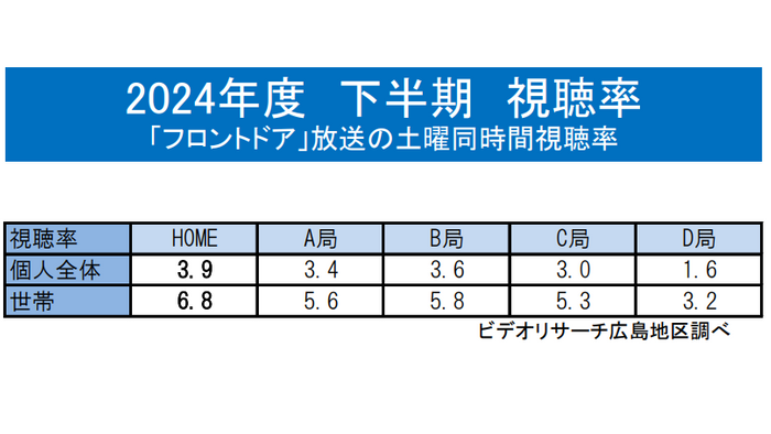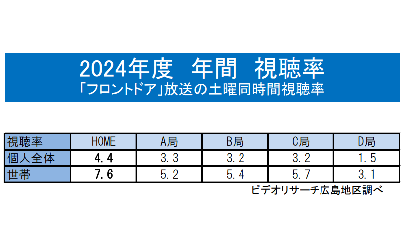 広島ホームテレビ(本社:広島市中区)で毎週土曜ごご1時から放送する「ひろしま深掘りライブ フロントドア」は、2025年の3月月間視聴率で個人全体の同時間帯1位(ビデオリサーチ調べ、広島地区)を獲得したほか、2024年度年間視聴率や1月クールなど4部門で1位の4冠を記録しました。