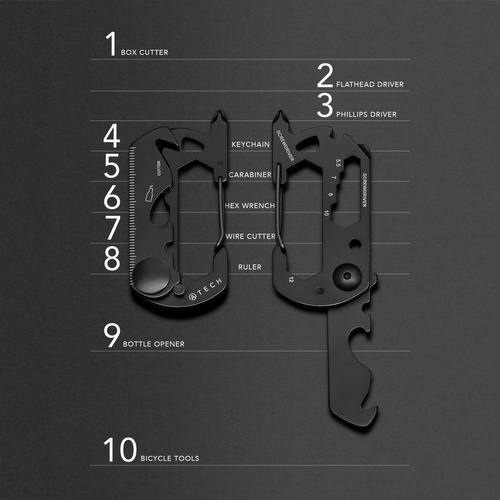 10個の機能! カラビナ、ボックスカッター、フィリップスドライバー、マイナスドライバー、キーチェーン、六角レンチ、ワイヤーカッター、定規、栓抜き、自転車ツールをコンパクトサイズにしカラビナに装備しました。軽量構造でどこへでも持ち運びでき、色々な場面で対応できます。頑丈なステンレススチールは過酷な条件にも耐えられ、滑らかな仕上がりで長期間の使用に耐える品質の素材を使用しています。