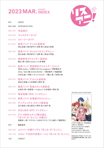 今回は、現在は入手が困難となっている「リスアニ!Vol.50」の特集記事(結束バンドキャスト撮りおろしインタビュー、クリエイター座談会など)を再録するほか、ポータルサイト「リスアニ!」で話題となった劇中バンド・結束バンドのアルバム制作関係者(長谷川育美、三井律郎、岡村 弦)によるスペシャル座談会を誌面記事として転載。