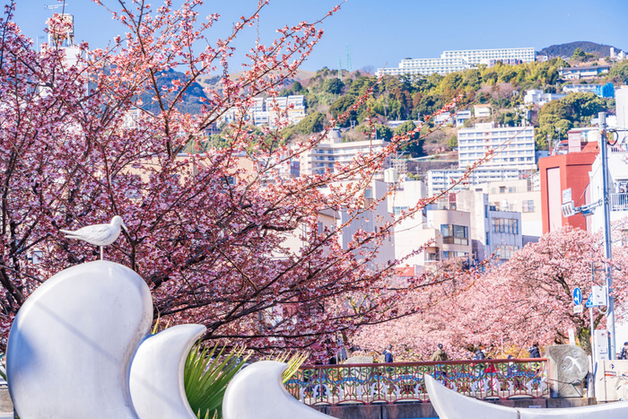 日本で最も早咲きの梅と言われる「熱海梅園」の梅。例年11月下旬から12月上旬に開花が確認されますが、早咲きから遅咲きまで品種が多く開花時期が異なるため、長い期間梅見をお楽しみいただけるのが特徴です。また、熱海では沖縄の寒緋桜と並ぶ日本でもっとも早咲きの桜「あたみ桜」を、市内中心部を流れる糸川沿い約300mの遊歩道の他にも、市内各所で愛でることができます。