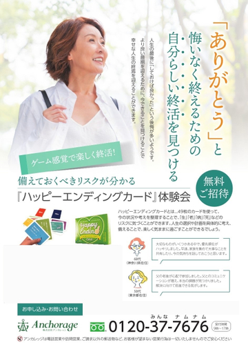一般社団法人日本HappyEndhing協会が製作したカードゲーム。各カードに書かれた内容に 「Yes」 「No」 などで答えていくことで、老後のリスクを洗い出すことができ、ゲーム感覚で楽しみながら、これからの人生と終活を考えるきっかけを提供します。