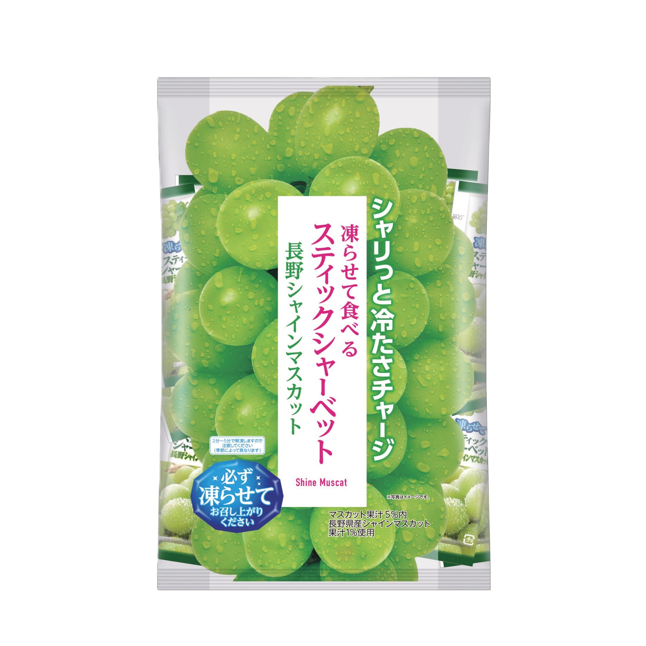 冷凍庫で凍らせて食べるスティックタイプのシャーベット。常温保存・持ち運びができ、購入後に凍らせるため、猛暑でも溶ける心配なく買い物ができるのが特長です。凍らせても固くなりにくい食感で、おやつにちょうどよい食べきりサイズに加え、シェアしやすい大容量タイプもラインアップ。こんにゃく粉を使用しています。
