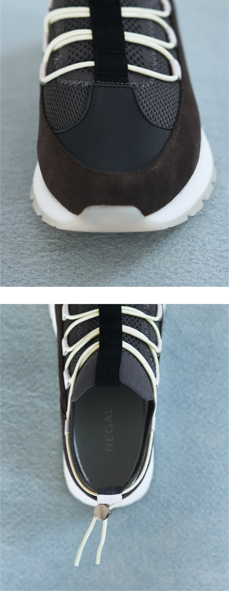 ゴム紐でフィット感を調節できる、ドローコード仕様のスニーカー。スポーティなルックスの中に、ヌバックやスエード、メッシュなどの異素材を絶妙にミックスし、単調にならない奥行きを持たせました。長時間のレジャーにも心強い厚底ソールに加え、足に優しくフィットするニットのトップラインが、スムーズな足入れを叶えます。靴紐を結び直す手間がいらないストレスフリーな一足は、休日のお出かけをより快適にサポートしてくれます。