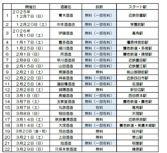 近鉄では、2025年12月7日(日)から2026年3月29日(日)まで、酒蔵を巡るハイキング「酒蔵みてある記」を計22回開催します。