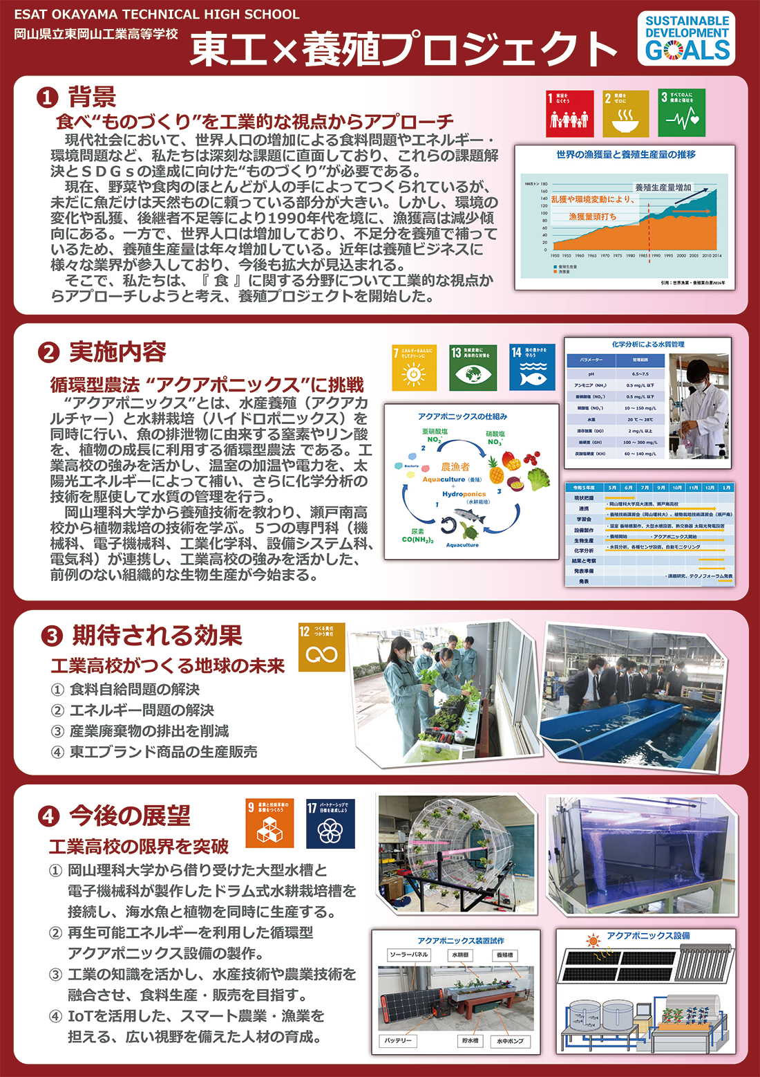 工業高校生が分野の垣根を越えて、付加価値の高い水産養殖と植物の栽培を同時に行う、循環型農法「アクアポニックス」に挑戦することになりました。設備の温度調節やポンプなどの電力は太陽光エネルギーでまかない、実習で培った化学分析の技術を駆使して水質を管理。さらに、岡山理科大学と連携し、体験学習を通じて養殖技術を学びながら、3年生の課題研究を中心に5科(機械科、電気科、電子機械科、工業化学科、設備システム科)が連携して研究に取り組みます。