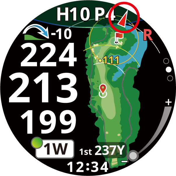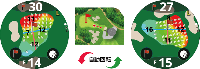 ドッグレッグのコースなど直接グリーンが見えない時に現在地からグリーンの方向を