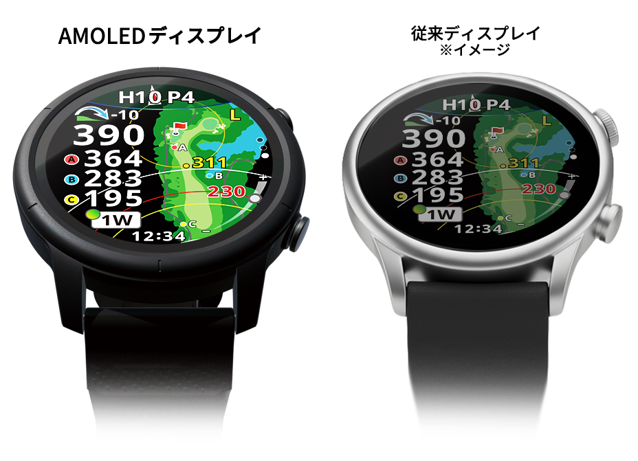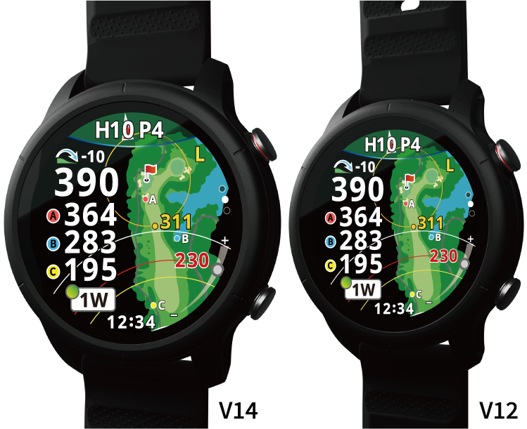 本製品は、従来モデルと比較してディスプレイの視認性を向上させたほか、より多くのゴルファーの装着感に対応できるよう、画面サイズが異なる1.43(V14)と1.2インチ(V12)の2サイズで展開いたします。