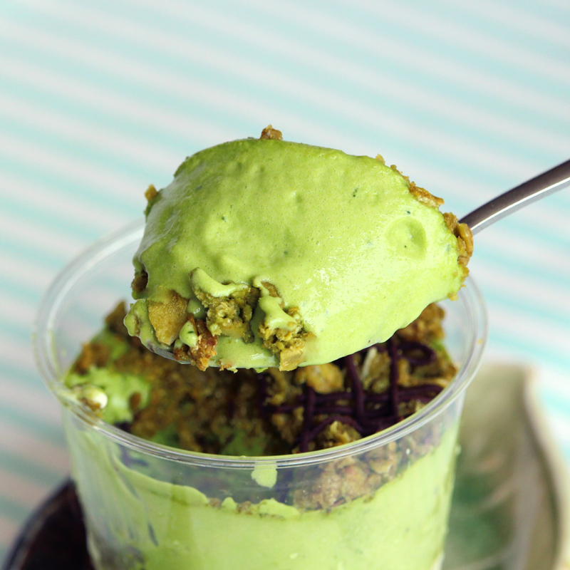(1) 新登場・抹茶クランチチョコ味:ごろっと食感の自家製抹茶クランチがたっぷり。一番上にはチョコソースをトッピングしました。