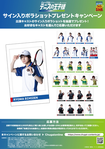 期間中、対象商品お買い上げ3,000円(税込)ごとにお渡しする応募ハガキに必要事項を記載の上、切手を貼ってご投函ください。会期終了後、厳正なる抽選の上、出演キャストのサイン入りポラショットをプレゼントいたします。