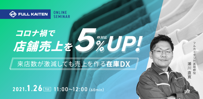 フルカイテン株式会社(本社・大阪市福島区、代表取締役・瀬川直寛)は2021年1月26日(火)、新型コロナウイルス危機下においても実店舗の売上を前年比5%増加させた小売企業の具体例を引き合いに、「今ある」在庫を活用して売上を立てる実践方法を解説するオンラインセミナーを開催します。