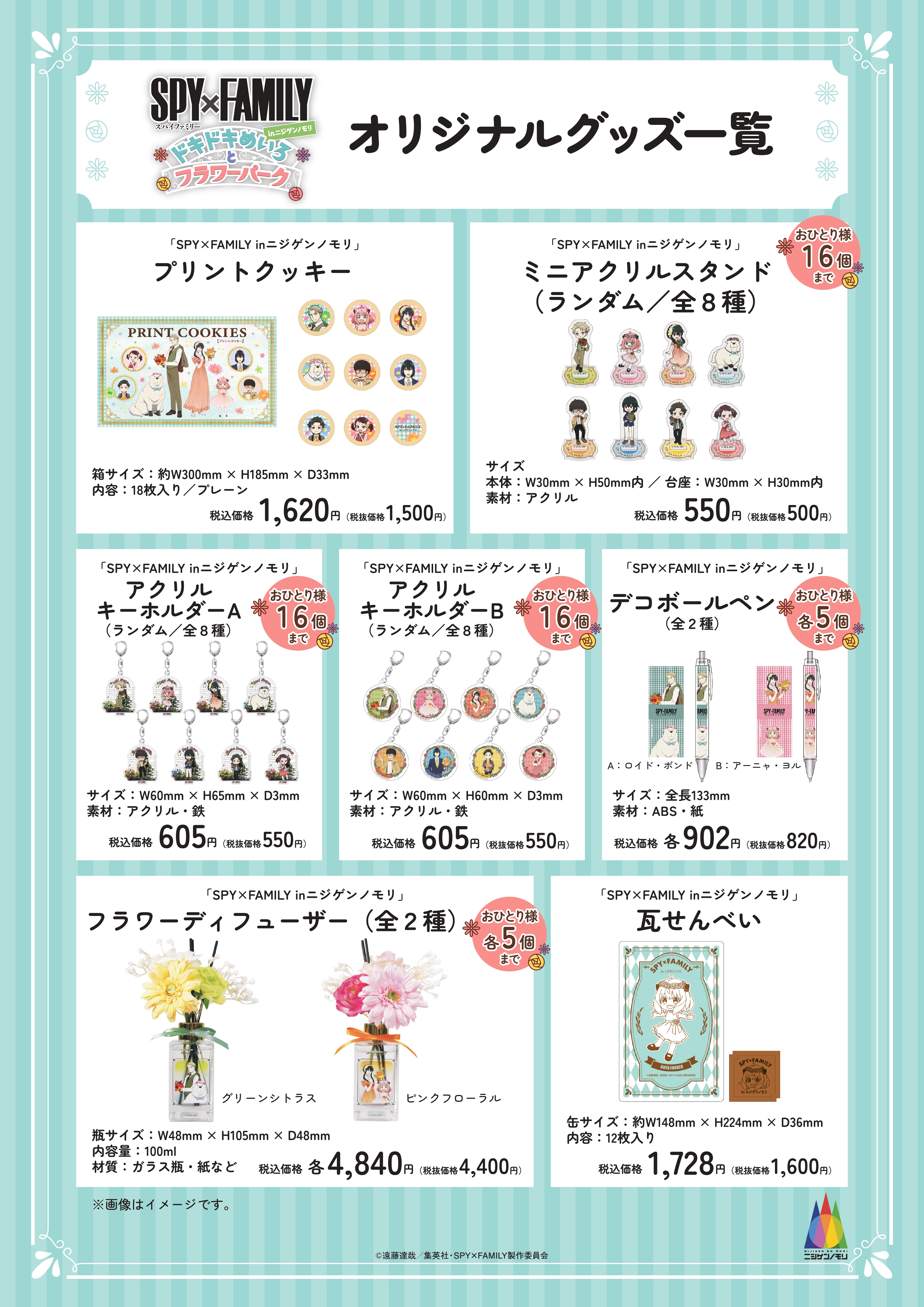 さらにイベント期間中、オリジナルイラストを使用した限定コラボグッズやキャラクターをモチーフにしたコラボフードも新たに販売いたします。イベント開始の4月20日(土)より、第1弾として全13アイテムのオリジナルコラボグッズ販売いたします。今回のコラボイベントのために新たに描き下ろされたフォ―ジャー家たちがデザインされたアクリルスタンドや缶バッジなどに加え、プリントクッキーや瓦せんべいなど、『SPY×FAMILY』の世界を満喫した思い出としてピッタリの商品が並びます。オリジナルグッズを2000円以上お買い上げいただいたお客様には、オリジナルクリアカード(ランダム/全8種)をプレゼントいたします。