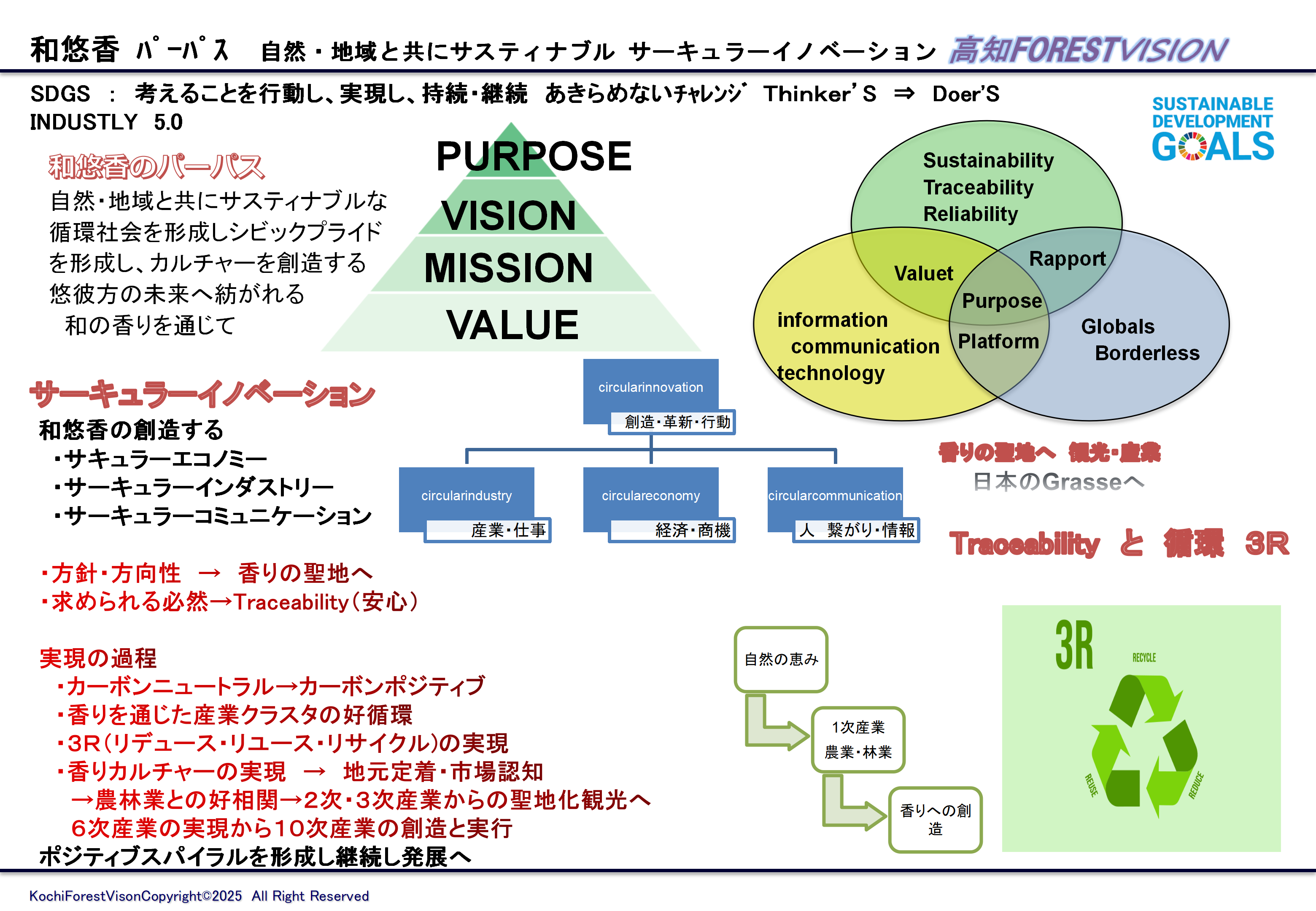 高知FORESTVISION株式会社では、自然と地域との共生として、サスティナブルな循環社会に向けて、サーキュラーイノベーションを掲げ行動し、サーキュラーエコノミー、サーキュラーインダストリー、サキュラーコミュニケーションを実現しています。