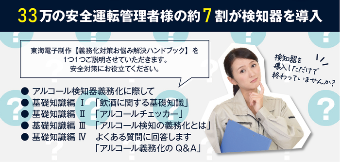 アルコール検知システム、 IT点呼システム、 運行管理システムを開発・販売する東海電子株式会社(本社:静岡県富士市 代表取締役 杉本 哲也)は、 この度、「【一般企業向け】アルコール検知器義務化対策お悩みハンドブックセミナー」を9月14日(木)に無料開催いたします。