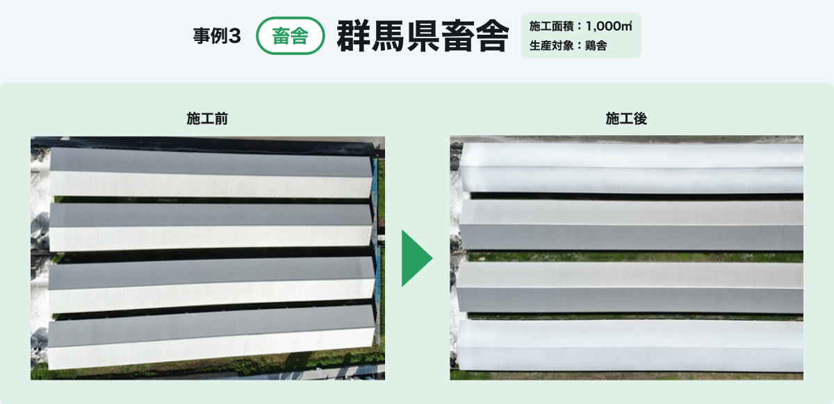 こういった高温対策の手段の一つに「遮光・遮熱剤」があります。「遮光・遮熱剤」は施設の屋根に塗布することで、光を反射し施設内部の温度上昇を抑制する効果があります。