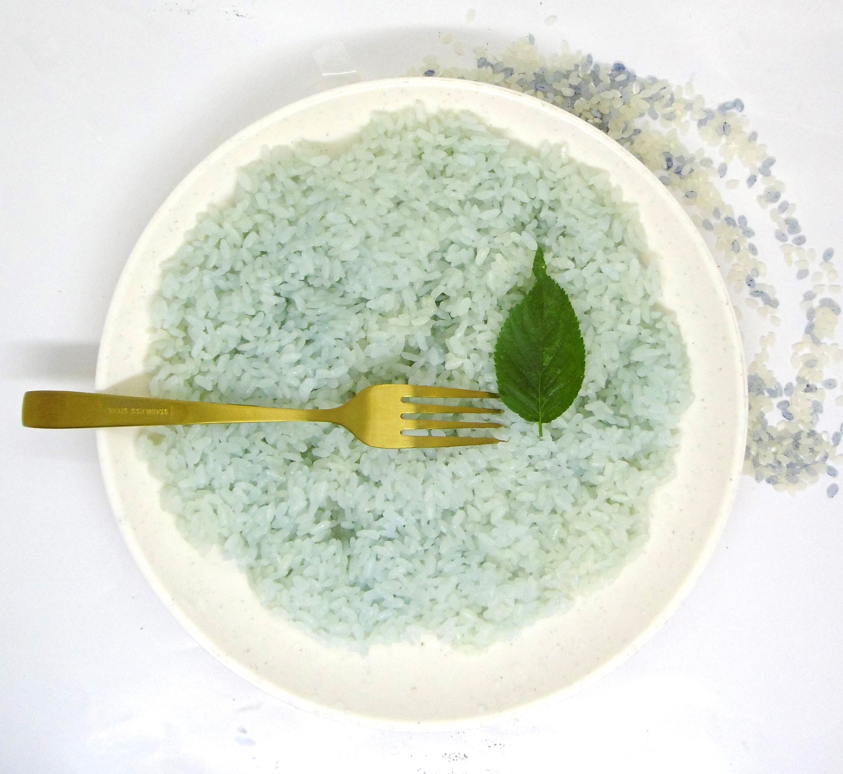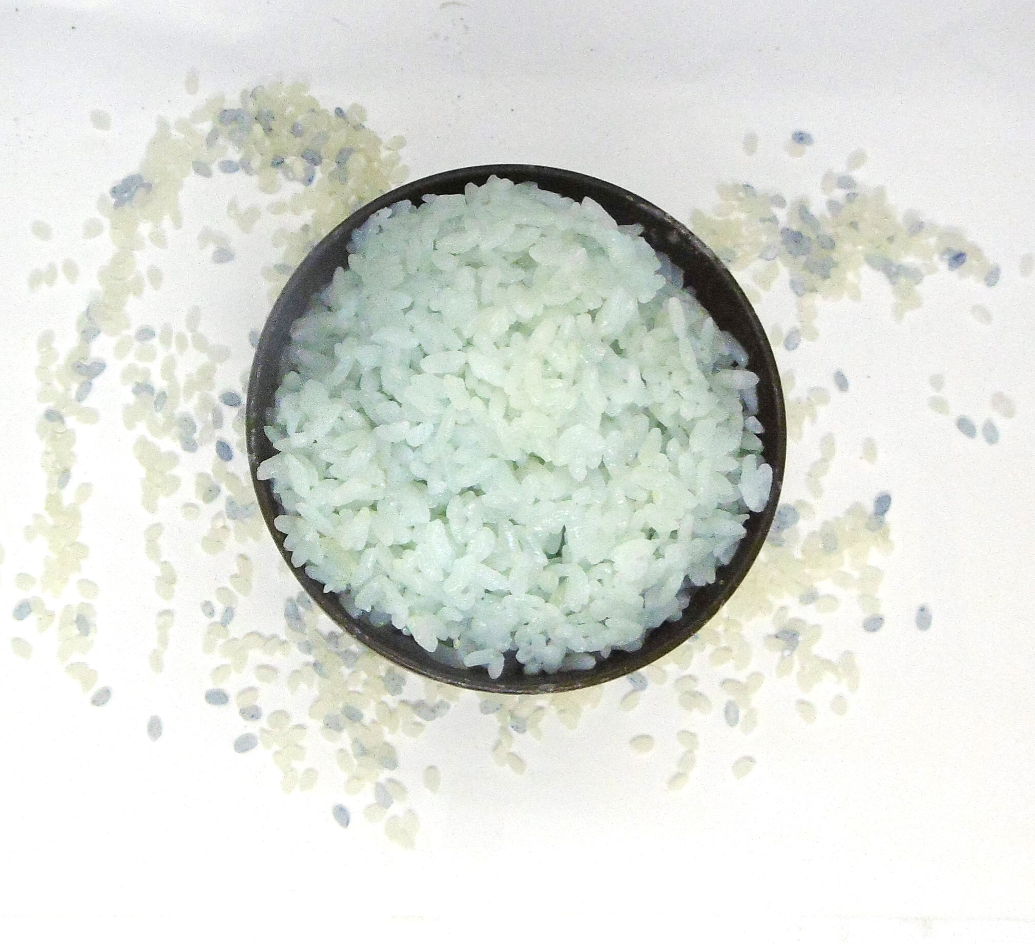 特許技術で米を蜂蜜、オリゴ糖、寒天、バタフライピー粉末、モリンガ粉末、植物性乳酸菌K-1で加工融合した着色料ゼロで安全安心で清涼感のある淡い青色の腸活ダイエットサポート米です。