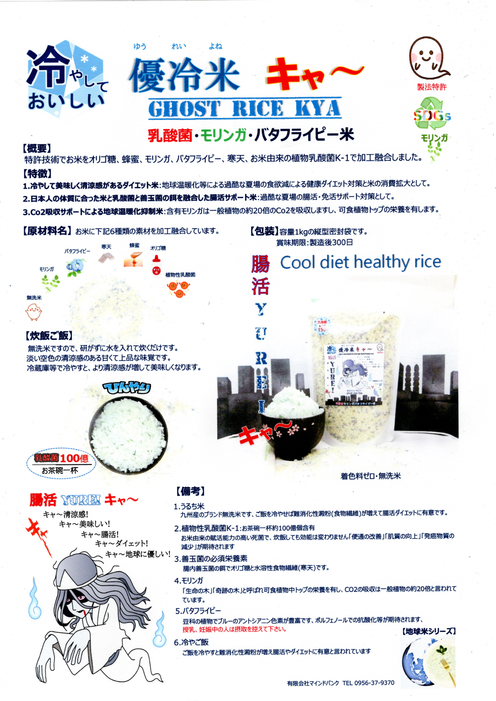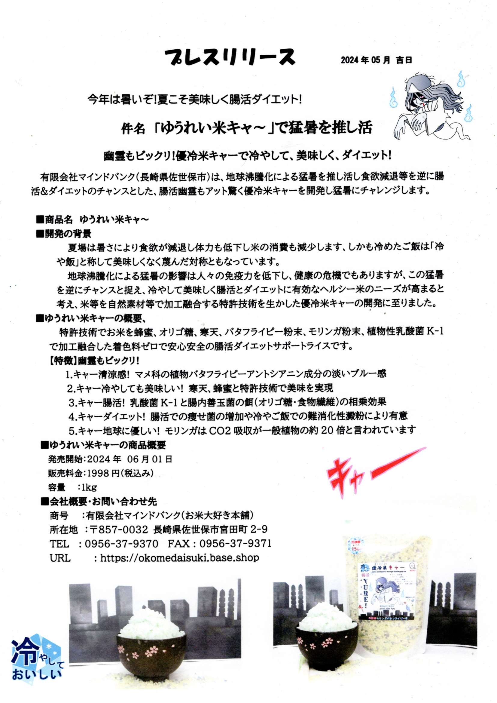 有限会社マインドバンク(長崎県佐世保市)は、地球沸騰化による猛暑を推し活し食欲減退等を逆に腸活&ダイエットのチャンスと捉え、ゆうれいもアット驚く「優冷米キャー」を開発。2024年6月6日に発売いたします。